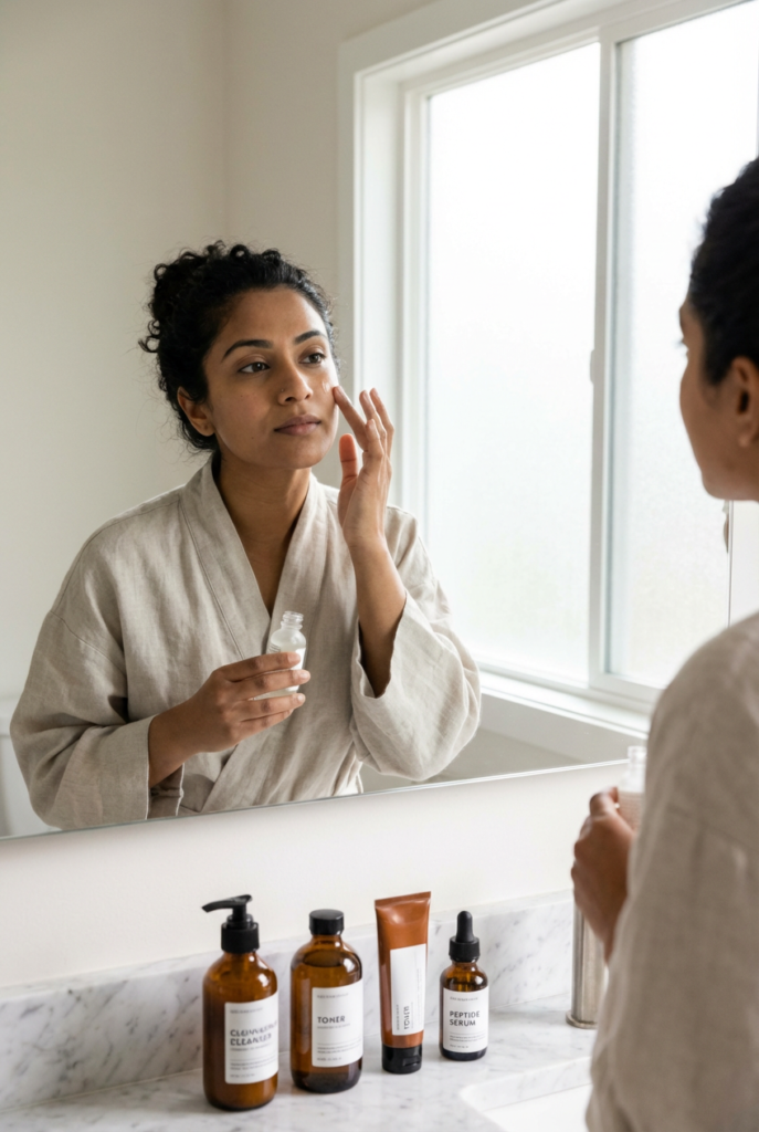 Peptide serums typically go on after cleansing and toning but before moisturizer. If you’re using multiple serums (no judgment, my bathroom cabinet is packed too), apply peptides before heavier oils or retinol products.