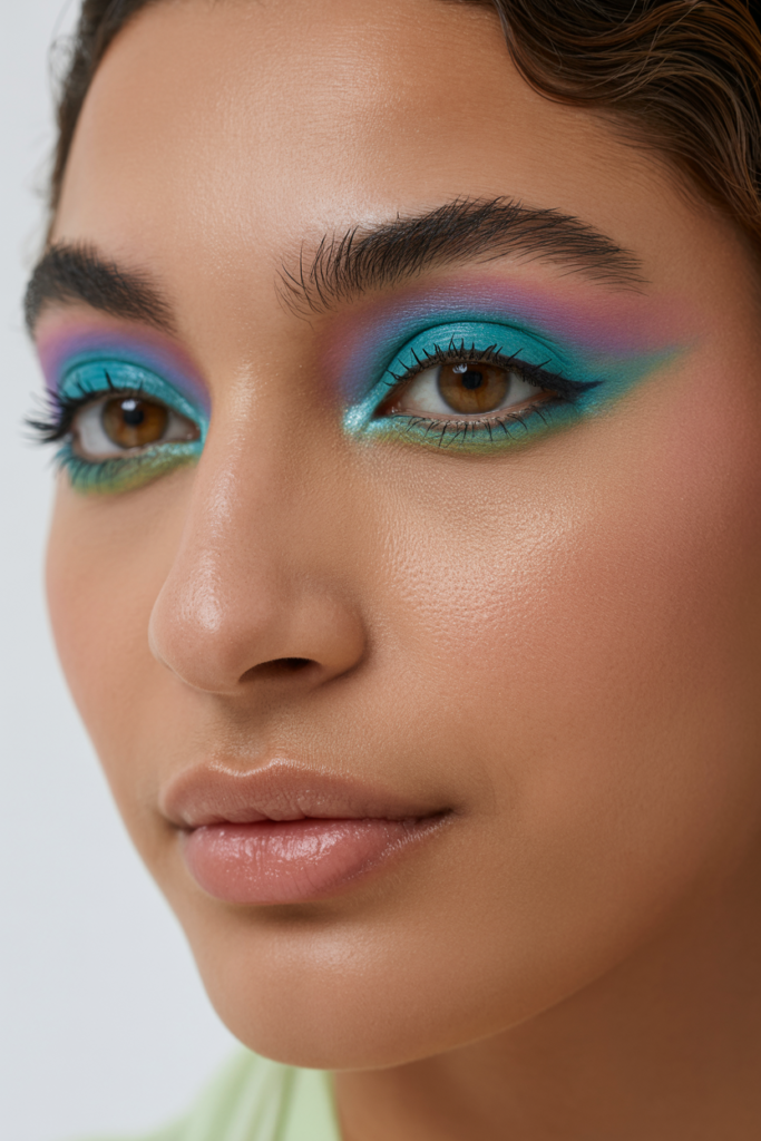 Colorful eyeshadow: After years of neutral minimalism, people embraced color again. Turquoise lids, pastel washes, and icy metallics showed up everywhere from runways to everyday looks.